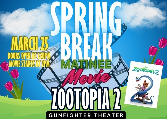 Join the Gunfighter Theater in a special showing of Zootopia 2! The movie is FREE! Concessions are available for purchase. Doors open at 1:30 and movie starts at 2pm. For any questions, please call 208.828.6229. |