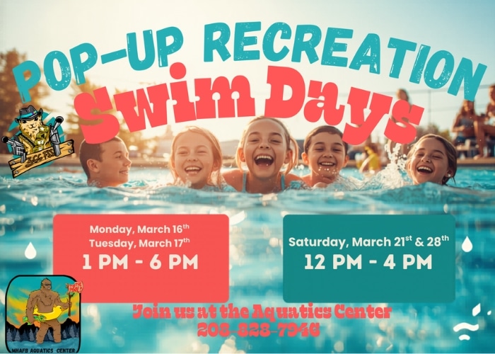 2 events,Join the Aquatic Center for a special pop-up recreation swim! On Monday, March 16th & Tuesday, March 17th from 1pm-6pm. Also on Saturday, March 21st & 28th from 12pm-4pm. For any questions, please call 208.828.7946.